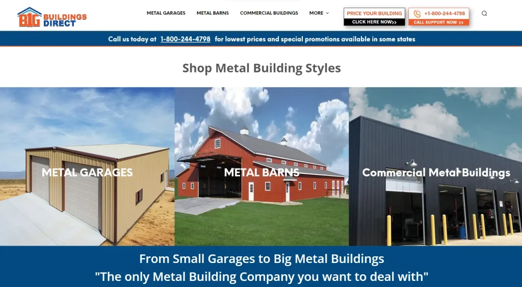 Big Business Direct is an Illinois-based metal building company offering prefabricated buildings for commercial and agricultural use. The brand specializes in mid-size buildings from 30×50-200×200. In addition, it offers small garages, barns, workshops, storage areas, and even retail buildings.